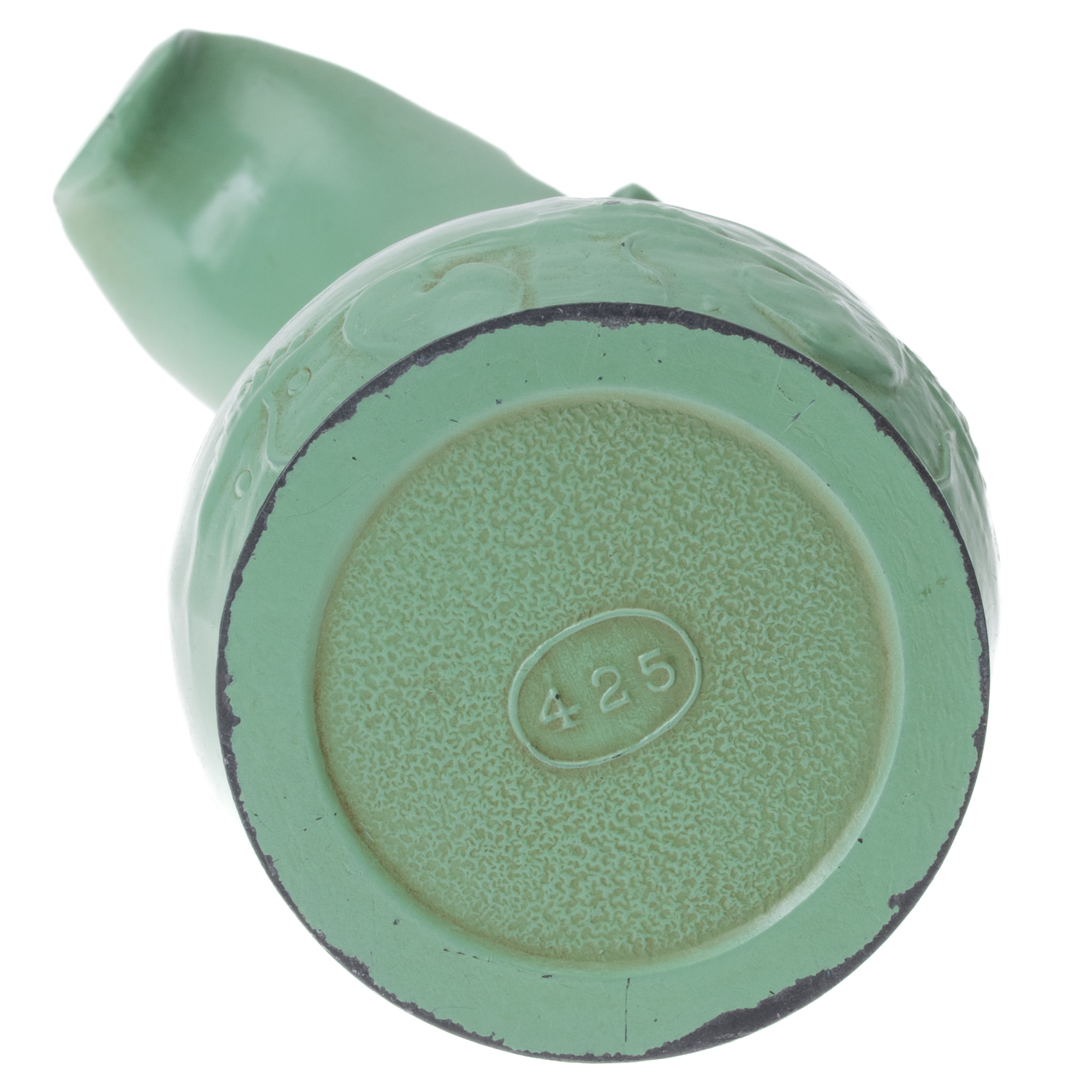 This piece measures 6.5 inches in height, 2.25 inches in base diameter, and weighs 1 lb 5 oz. Condition shows some wear to the green painted surface and minor edge chips, consistent with age and use. Presents beautifully and makes a striking display piece for lovers of Art Nouveau design, mythological themes, or early 20th-century decorative metalwork.