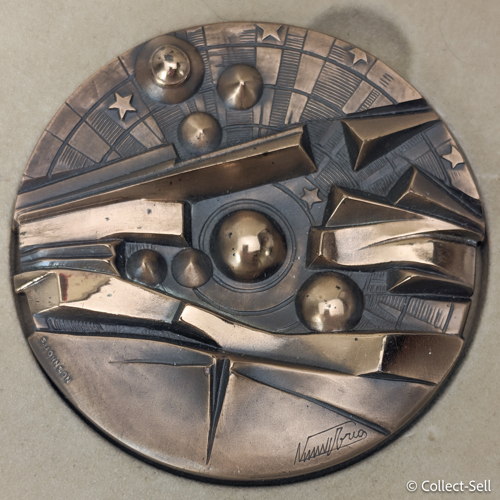 Designed by Jorio Vivarelli (1922–2008), one of Italy’s foremost sculptors and medalists, the piece features his characteristic abstract relief style with geometric planes, stars, and rising forms symbolizing renewal and progress.