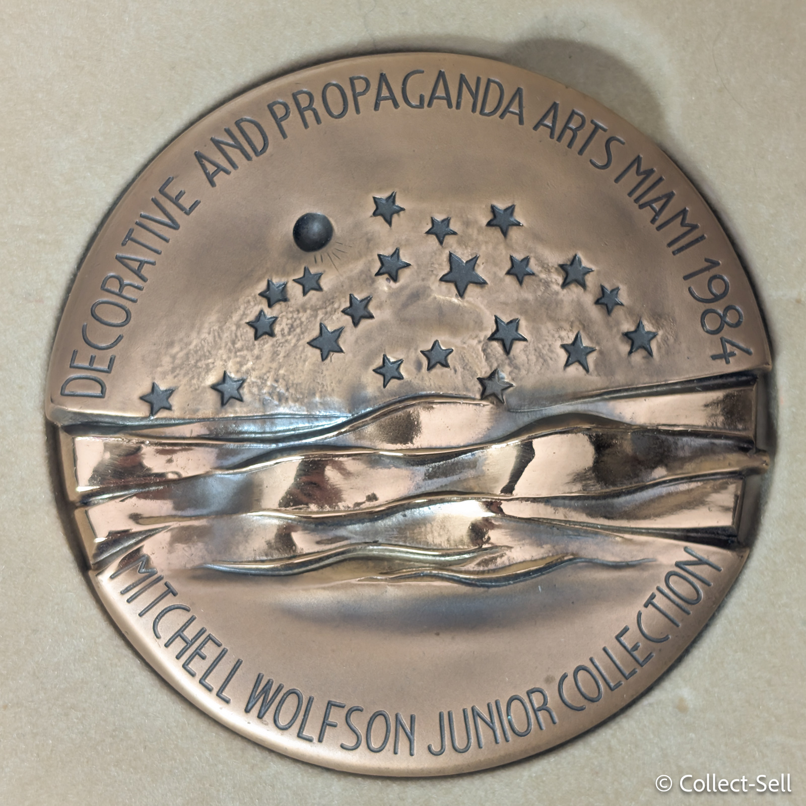 This striking bronze art medal was issued in 1984 to celebrate the inauguration of the Mitchell Wolfson Jr. Collection of Decorative and Propaganda Arts in Miami, Florida — a museum dedicated to 20th-century design and political art.
