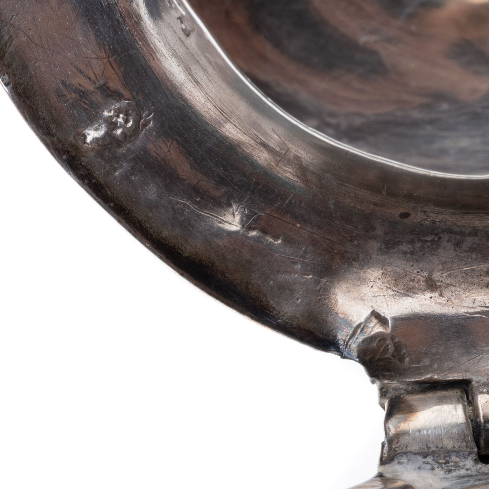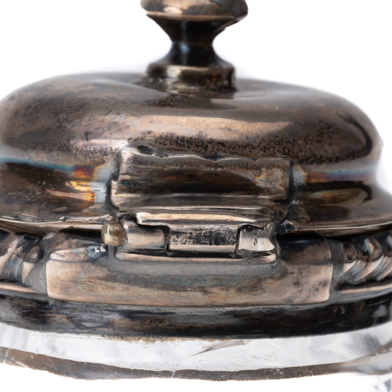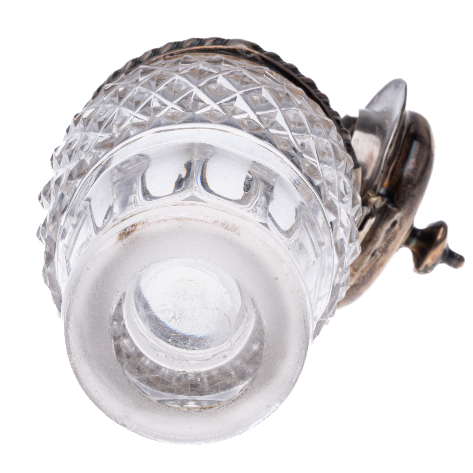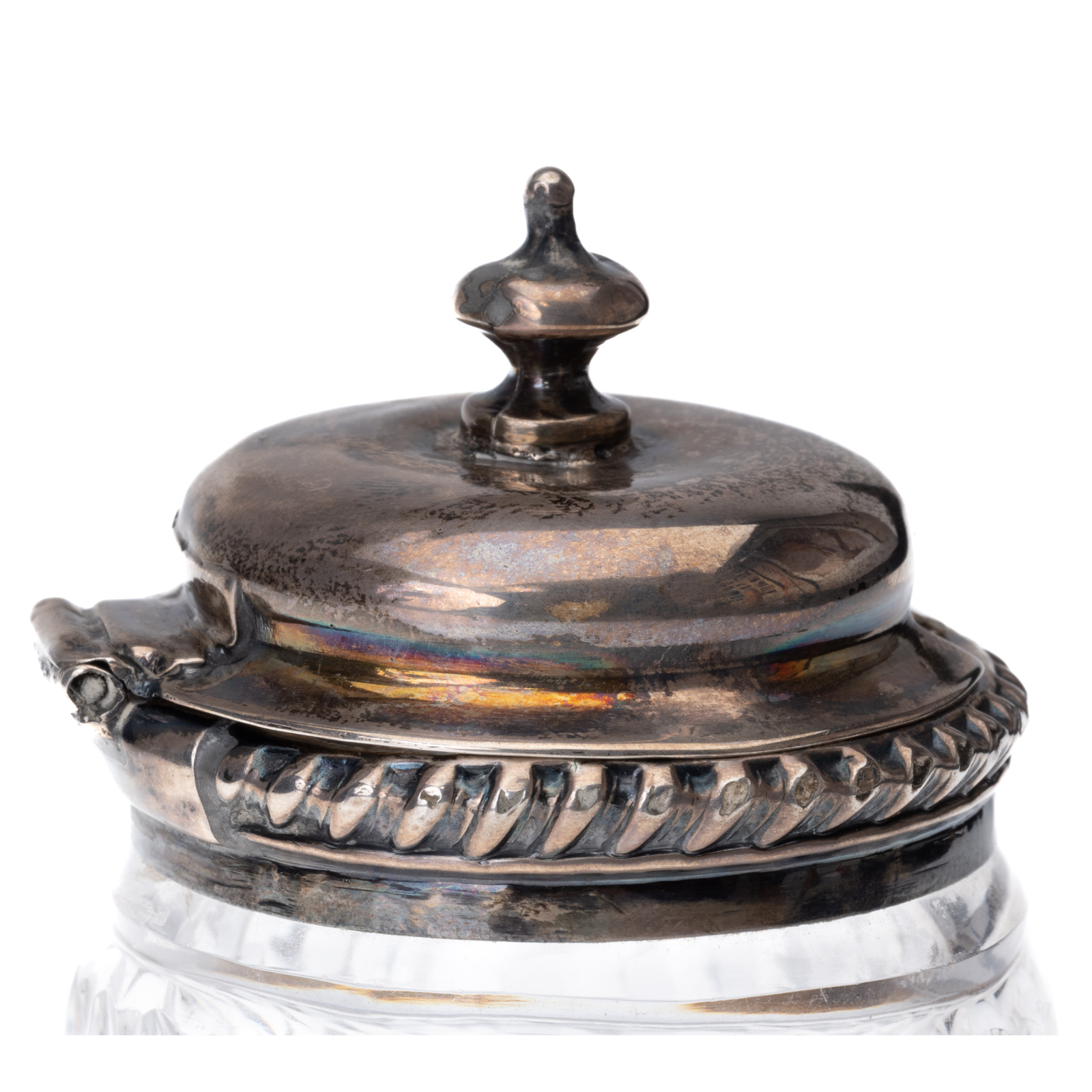 A finely crafted early 19th-century English sterling silver and cut glass mustard pot, made by Thomas Watson & Co. in Sheffield in 1824. The base is composed of faceted, diamond-cut crystal, paired with a hinged sterling silver lid and collar. The domed lid features a thumbpiece and spoon notch. Fully hallmarked on the collar with the maker’s mark T.W. & Co, lion passant (925 Sterling), Sheffield, and the date letter a under crown for 1824.