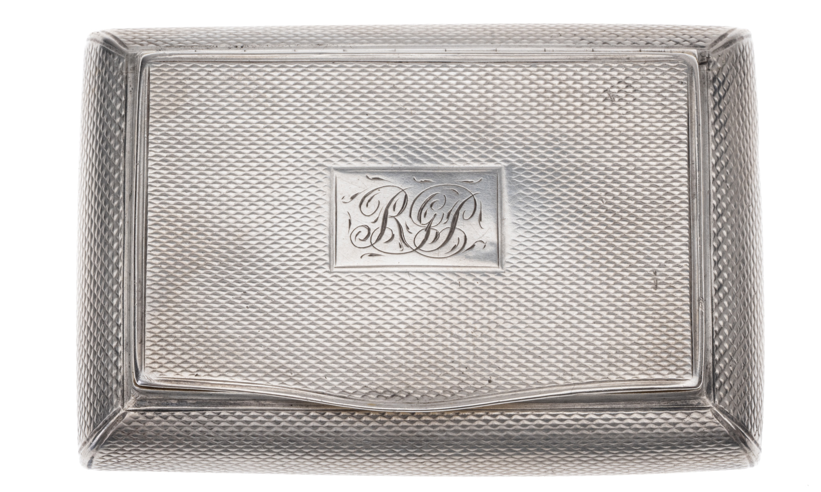 This fine sterling silver snuff box was crafted in Birmingham in 1833 by renowned silversmith Joseph Willmore. The rectangular form is decorated with crisp engine-turned guilloché patterning to all sides, centering a rectangular cartouche engraved with the script monogram “RGP.” The hinged lid opens to reveal a richly gilded interior, protecting the silver from tobacco corrosion.