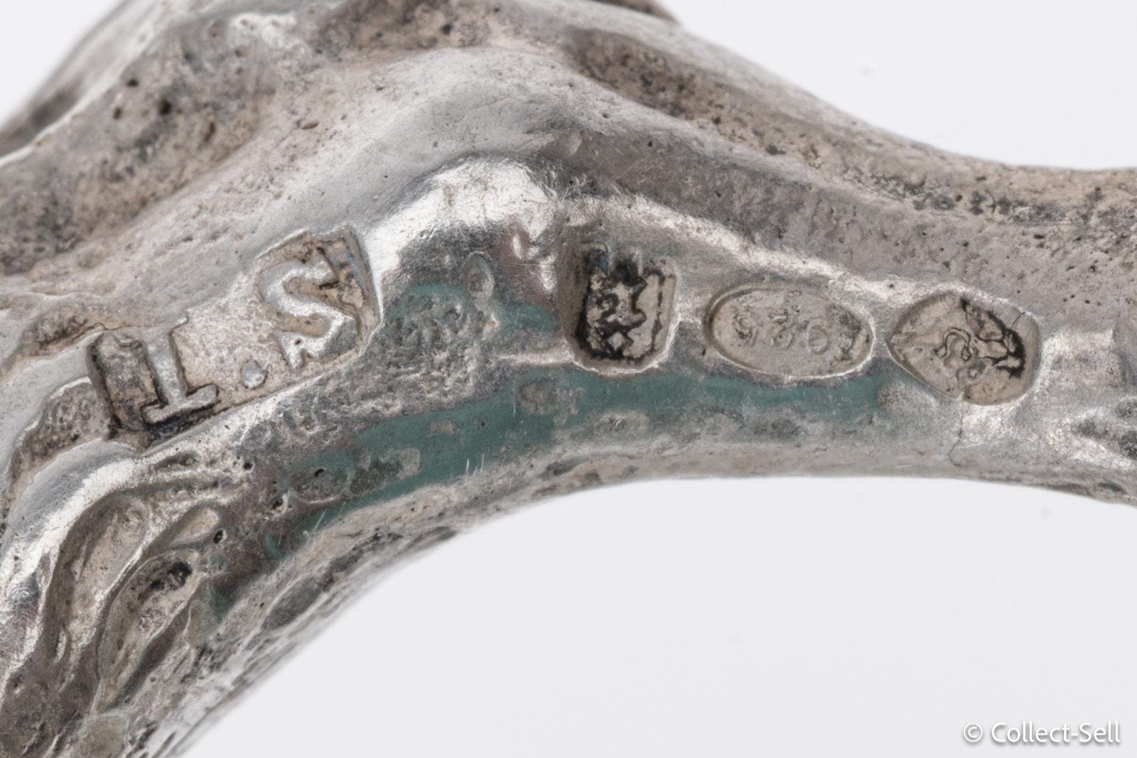This sterling silver donkey figurine was imported into England by Israel Segalov and assayed in London in 1924. Measuring 2.75 inches tall and 3 inches long, and weighing 57.3 grams, the donkey is skillfully modeled with textured fur, bridle, and saddle. The underside carries full English hallmarks: the maker’s mark I·S for Israel Segalov, the lion passant for sterling, the leopard’s head for London, and the date letter “i” for 1924.
